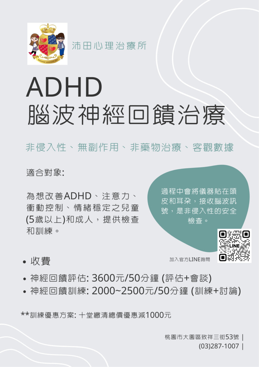 1. 先進行腦波神經回饋評估,3600元/50分鐘(含評估、會談、講解)。